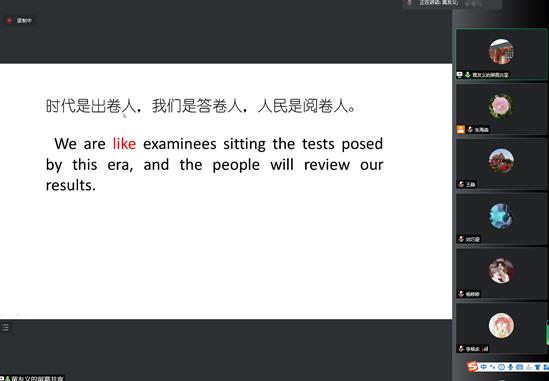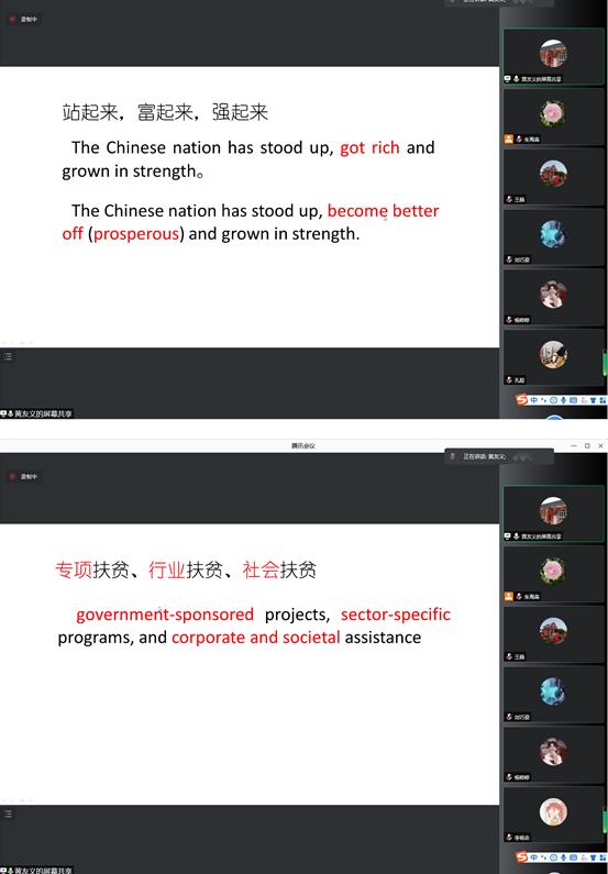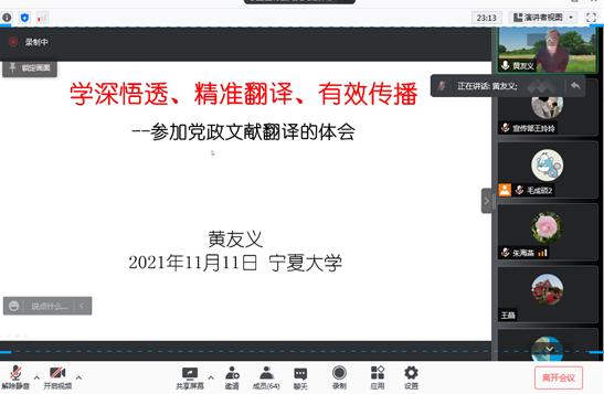 2021年11月11日下午2:15,中国外文局前副局长黄友义老师在350vip8888新葡的京集团登录入口进行党政文献翻译经验分享线上讲座,会议由350vip8888新葡的京集团,朱海燕院长主持,350vip8888新葡的京集团,全体二年级翻译硕士、部分一年级翻译硕士、部分二年级学术型硕士和部分翻译硕士导师参加了此次讲座。讲座围绕“学深悟透、精准翻译、有效传播”主题展开。黄老师通过总结自身长期参加党政文献英译实践,从领会精神实质、采用最精准的英语表达和重视译文对外传播效果三个方面介绍了具体的案例。
