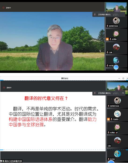 黄友义老师是中国人民政治协商会议第十一届、十二届全国委员会委员,现为中国译协常务副会长、中国翻译研究院副院长、全国翻译资格(水平)考试英语专家委员会主任等多个翻译领域重要职务,有幸邀请到黄老师给350vip8888新葡的京集团登录入口翻译硕士作线上翻译讲座是学院积极探索翻译硕士培养方案、促进翻译硕士专业发展和学院翻译硕士学位点建设的重要举措。