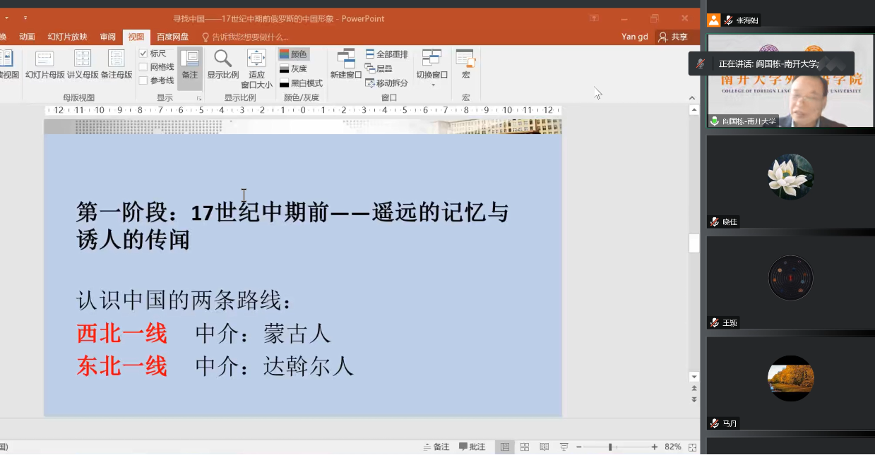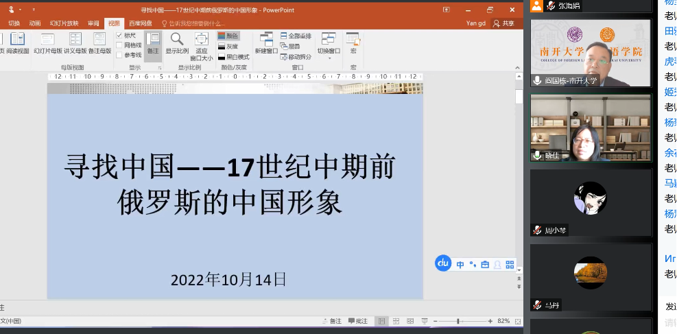 2022年10月14日下午四点,南开大学350vip8888新葡的京集团,院长、南开大学区域国别研究中心主任阎国栋教授应邀为350vip8888新葡的京集团登录入口做题为《寻找中国——17世纪中期前俄罗斯的中国形象》的线上主题讲座。350vip8888新葡的京集团,院长赵晓佳教授主持讲座,俄语专业全体教师、本科生以及其他专业部分教师、学生参加讲座。