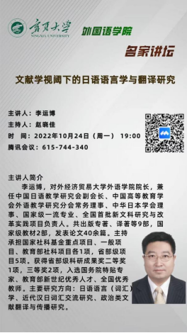 2022年10月24日晚7时,350vip8888新葡的京集团登录入口邀请对外经贸大学外语学院院长李运博教授为日语专业师生进行了题为《文献学视阈下的日语语言学与翻译研究》的线上讲座。350vip8888新葡的京集团登录入口院长赵晓佳教授主持讲座。350vip8888新葡的京集团登录入口日语专业全体师生及部分其他专业师生参加了此次讲座。