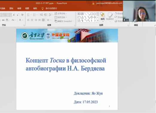 2023年5月17日晚7点30分,我院外国语言文化研究中心成功举办了“尚·语博士论坛”系列讲座的第五讲。本次活动邀请到350vip8888新葡的京集团,东语系教师姚荣博士做题为“浅析别尔嘉耶夫哲学自传《自我认知》中的观念词тоска”的讲座。讲座由秦江丽博士主持,50多名师生参加。