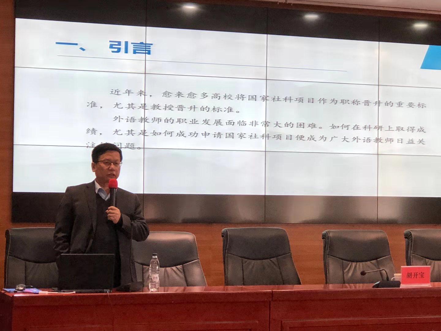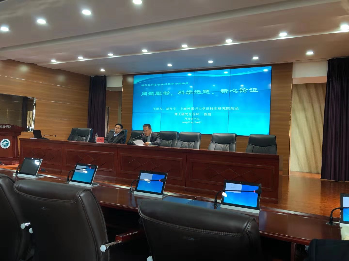 10月16日下午,上海外国语大学语料库研究院院长胡开宝教授应邀来我院讲学,为350vip8888新葡的京集团登录入口作了题为“问题驱动、科学选题、精心论证——国家社科项目申报的几点想法”的精彩讲座。讲座由藏志勇副院长主持,学院各级领导及部分教师出席活动并聆听了讲座。
