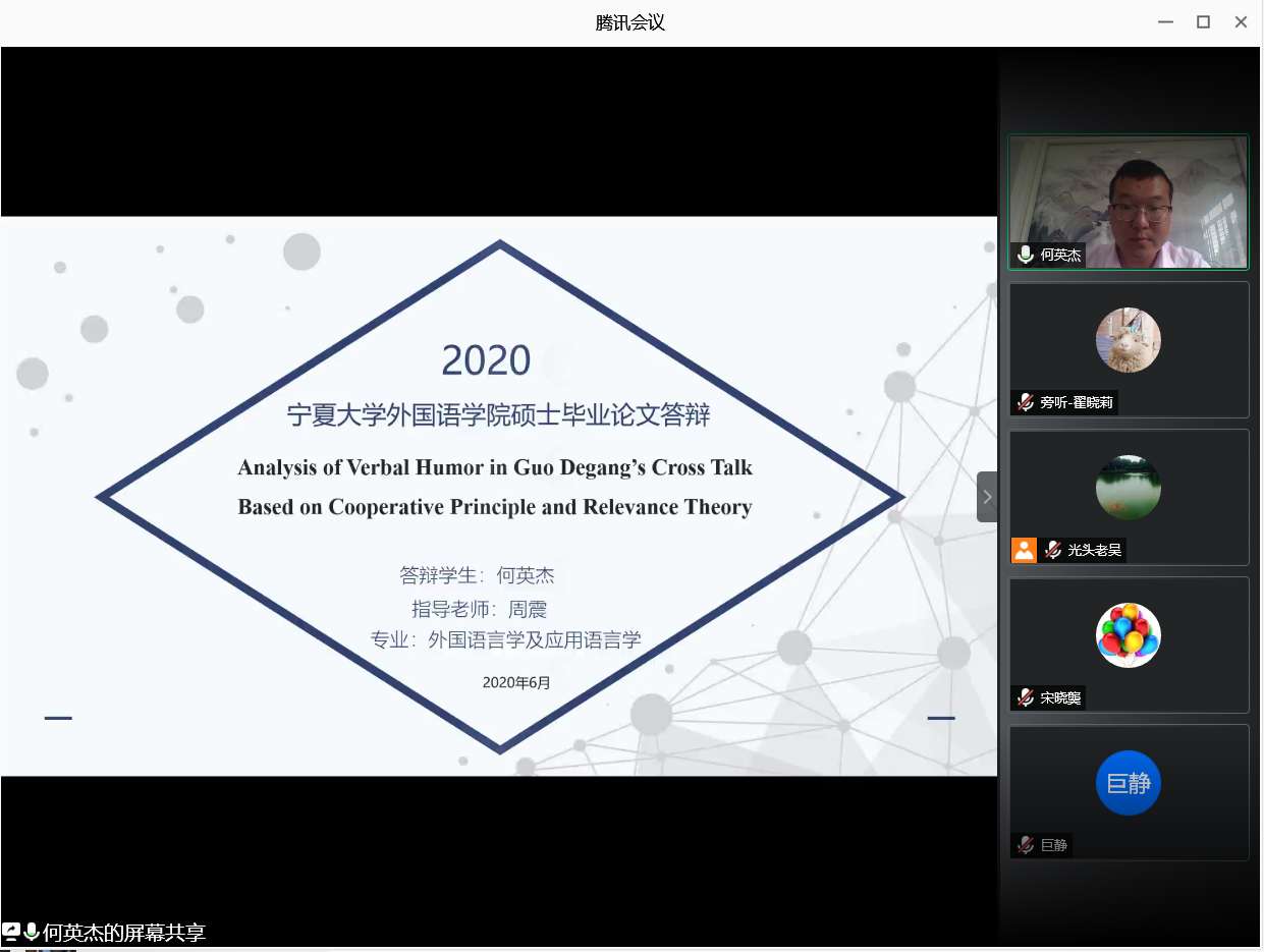 根据学校相关要求,350vip8888新葡的京集团,顺利精心组织并顺利完成了2020届硕士研究生的线上论文答辩工作。其中,英语语言文学、外国语言学及应用语言学、口译、笔译和学科教学(英语)专业共56名同学,分别于6月1日、6月2日、6月4日、6月5日共分为8组,以邀请的校外专家老师、校内专家导师作为评委组,有序顺利地进行了线上答辩。