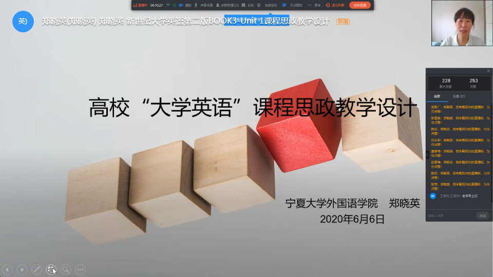 我校《大学英语》课程应邀参加了上海外语教学出版社举办的“高校外语课程思政教学设计与示范教学”线上研修,350vip8888新葡的京集团,公外部选派郭晓燕、郑晓英、朱海燕三位教师分别于5月16日、6月6日和6月18日在钉钉平台上围绕“外语课程思政”主题进行教学设计和在线直播。全国各地2万多名外语教师在线观看,并进行了线上交流与互动,对三位老师关于《大学英语》课程思政的精心设计和精彩示范给予了充分肯定。