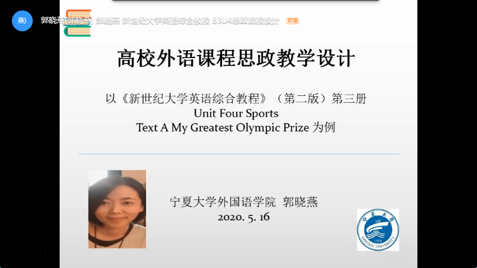 郭晓燕老师以Text A:我最珍贵的奥运奖牌为例,通过观看视频了解奥林匹克口号“更高、更快、更强”和北京2008奥林匹克运动会“同一个世界,同一个梦想”的口号,组织学生讨论思考这两个口号所蕴含的价值观,引导学生进入A篇文章的阅读,从而进一步探索文章所反映的奥林匹克精神。针对设计的5个阅读问题将所涉及的思政点进行拓展讨论,引出“君子和而不同"“求同存异”“奋力拼搏”“和谐共赢”“和为贵”“是挑战还是机遇?是对手还是伙伴”等充分体现中国价值观的理念,把语言教学目标和思政目标有机结合起来。