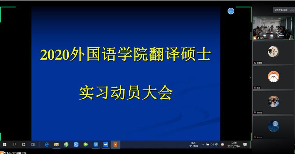 为更好地落实2019级翻译硕士实习工作,350vip8888新葡的京集团,2019级翻译硕士学生实习动员大会于2020年7月16日上午10点通过腾讯会议召开。余洁副书记、朱海燕副院长、学位点负责人谢丽欣老师、全体实习指导教师以及2019级口笔译研究生参加了此次会议。会议由MTI硕士学位点负责人谢丽欣老师主持。