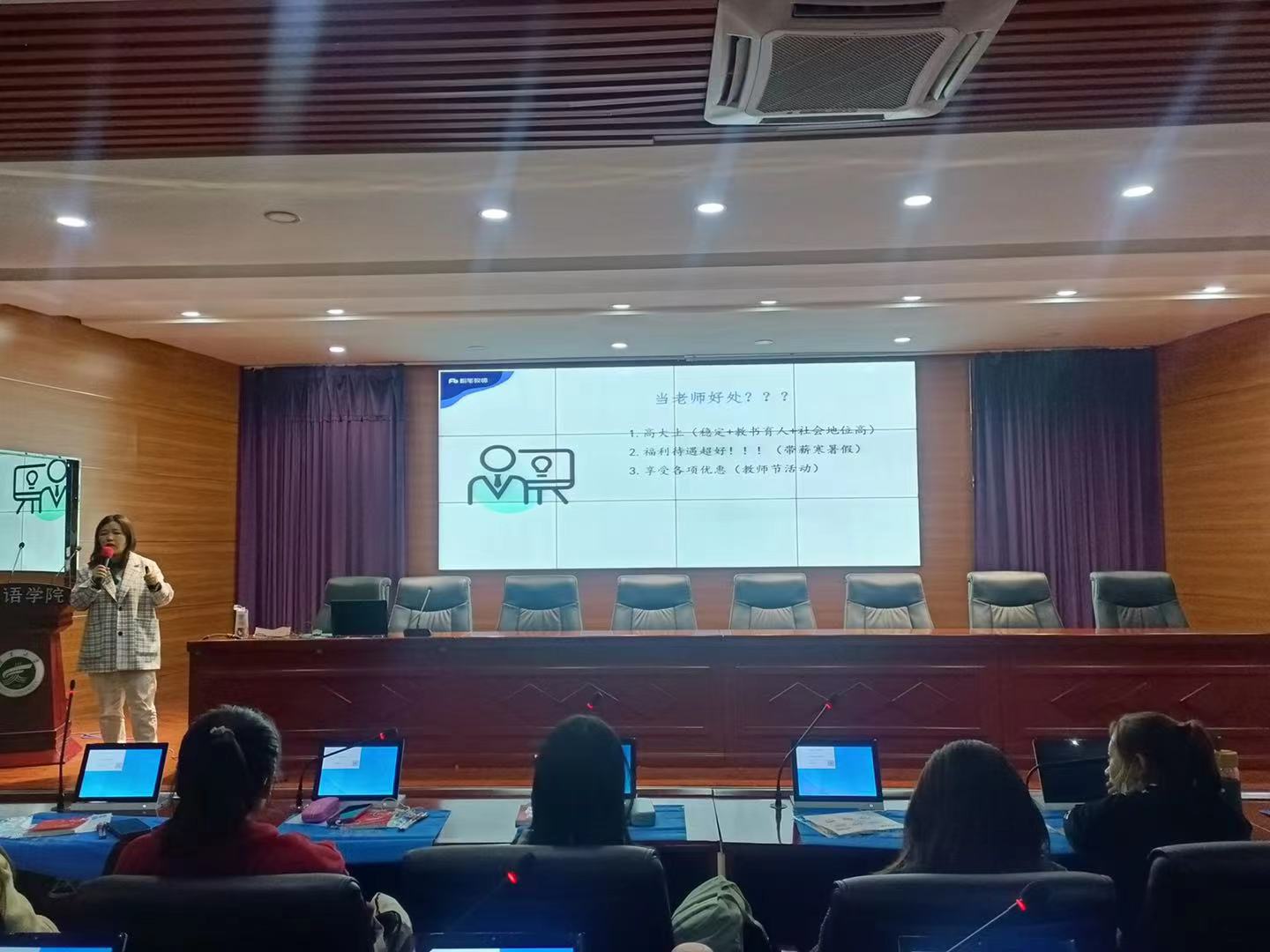 本次讲解会主要从考情政策、教师资格笔试、备考指导三个方面展开详实的讲解。首先,马老师对教资考取的相关背景进行介绍。她认为,成为一名国家教师在行业前景、福利待遇等方面具有诸多优势。在“双减”等政策的指导下,国家教师资格的考取已经成为一众人群的“必选项”。同时也告诉在场学生应抓紧时间、合理规划,在大学黄金期开始备考。