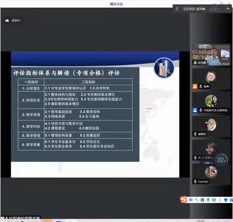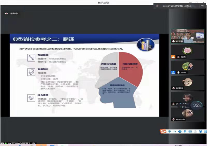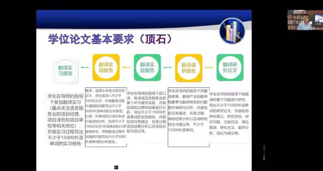 为进一步推进我校翻译硕士学位点建设,提升翻译硕士人才培养质量,尤其是翻译实践报告(论文)写作指导能力,2021年10月21日星期四下午2:00,350vip8888新葡的京集团,特邀请广东外语外贸大学翻译学研究中心主任、全国翻译专业学位研究所教育指导委员会委员兼秘书长赵军峰教授针对我校翻译硕士培养予以线上指导。赵军峰教授在“腾讯会议”平台以“从‘基石’到‘顶石’翻译人才培养的理念和原则”为题进行线上讲座。350vip8888新葡的京集团,全体翻译硕士导师和任课教师参加了线上培训。