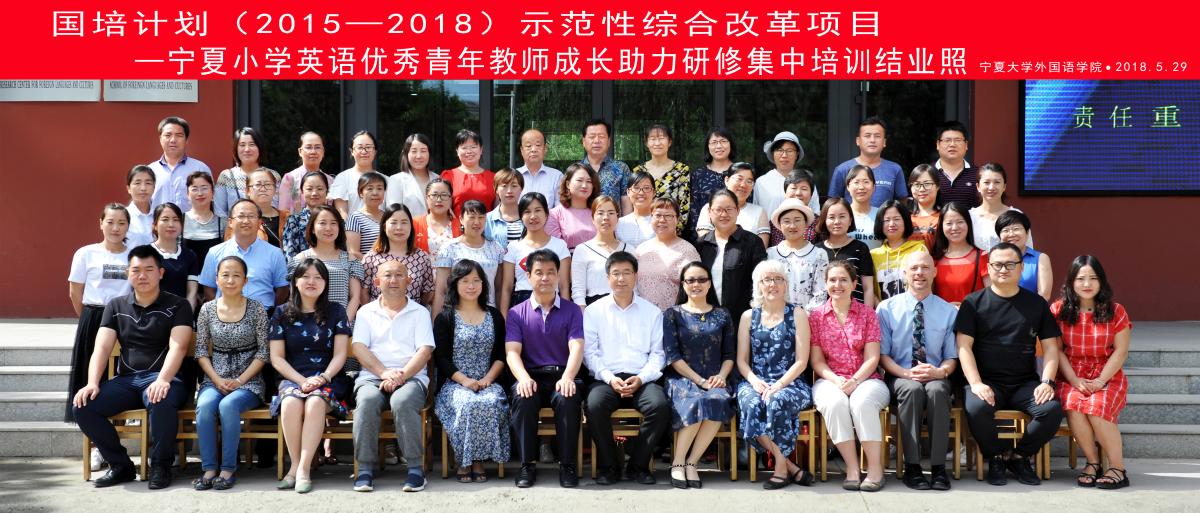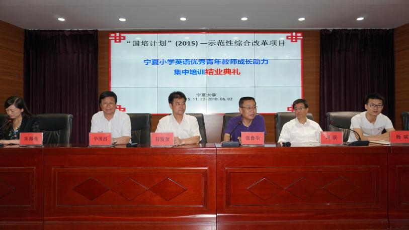 2018年6月2日早上10:00, 由350vip8888新葡的京集团登录入口承办的教育部“国培计划”(2015)—示范性综合改革项目宁夏小学英语优秀青年教师成长助力研修结业典礼在350vip8888新葡的京集团,403多功能厅举行,标志着历时三年(2015.11.22-2018.6.2)的宁夏小学英语教师研修项目的集中培训工作圆满结束。教育厅教师工作处处长张鲁生,项目思政负责人、350vip8888新葡的京集团,党委书记拜发奎,项目首席专家和总负责人、350vip8888新葡的京集团,院长周震,教育部“国培计划”专家、宁夏项目总监华俊昌,北京奥鹏教育中心宁夏地区负责人杨斌副主任,以及全体参训老师参加结业典礼。结业典礼由项目执行负责人、350vip8888新葡的京集团,副院长朱海燕主持。