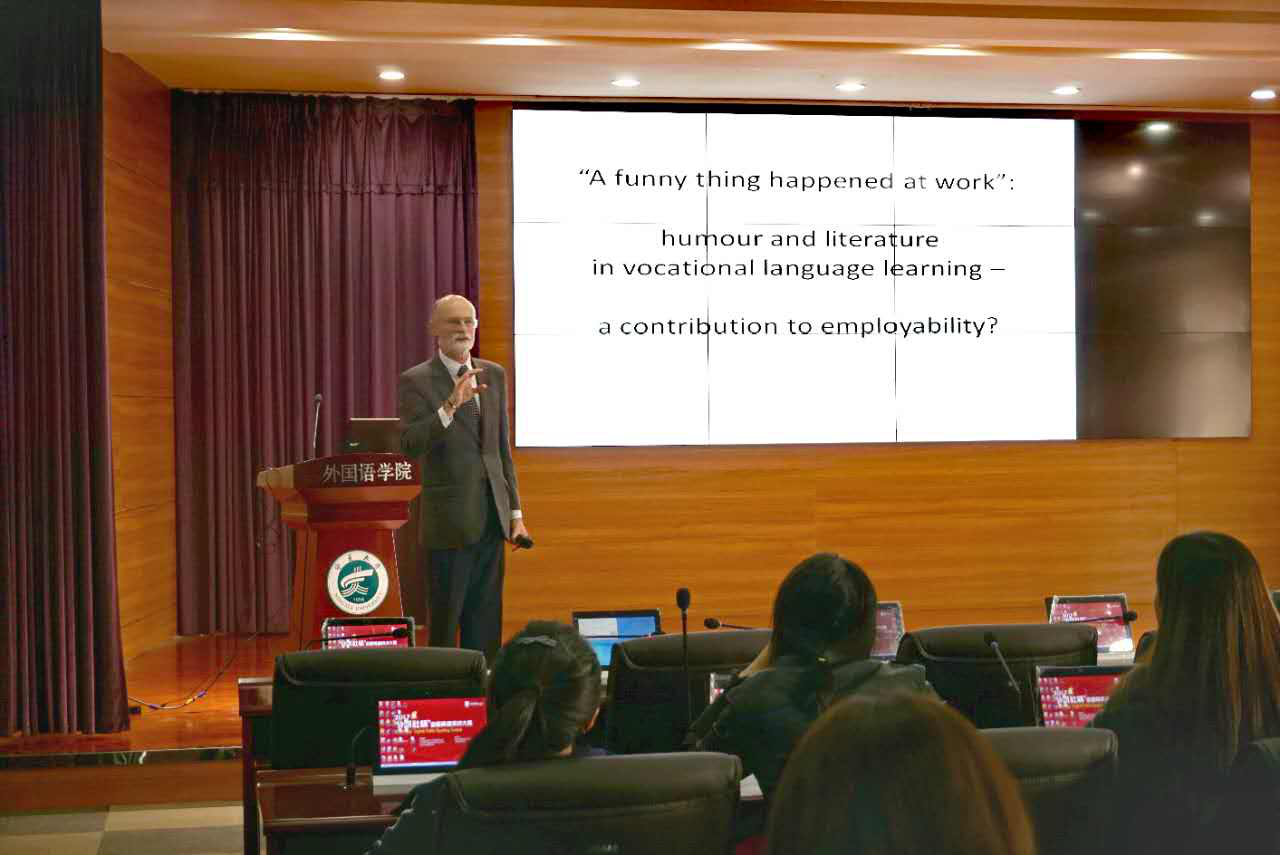 10月31日下午“Humour and Literature in Vocational Language Learning”主题讲座在我院403报告厅成功举办,讲座主要针对全院教师及研究生。讲座过程中,ColinBeaven教授分别从广告、新闻、照片、电影、小说等多个角度举例,对“humor”的意义进行了阐释。此外,教授还建议同学们通过听力训练、论文写作等方式提升英语能力。讲座之余,Colin Beaven 还同我院研究生进行了深入交流,让研究生们对纯正的英语有了更进一步的认识。