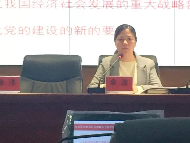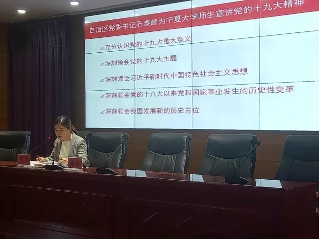 典礼上,学院党委副书记余洁老师结合自己参加石泰峰书记到宁夏大学宣讲党的十九大座谈会的体会,带领学院各班班长、团支书,入党积极分子、建党对象,学习了石泰峰书记的讲话。余洁老师按照石泰峰书记讲话的一个充分认识和八个深刻领会,通过导读和分享学习体会的方式带领大家学习石书记讲话精神。