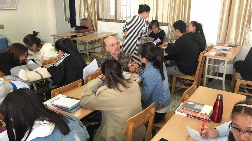 为配合学校“课堂教学质量提升年”计划,提高我校大学英语课堂的教学质量,经与350vip8888新葡的京集团,外教协商, “外教进大学英语课堂”活动于2018年3月28日早晨7:40正式开课。活动由Dale De Weerd、Sarah Beth Harmon、Carolyn Stent、Bob Cheah四名外教分为两组分赴2017级非英语专业本科生的大学英语课堂进行教学。