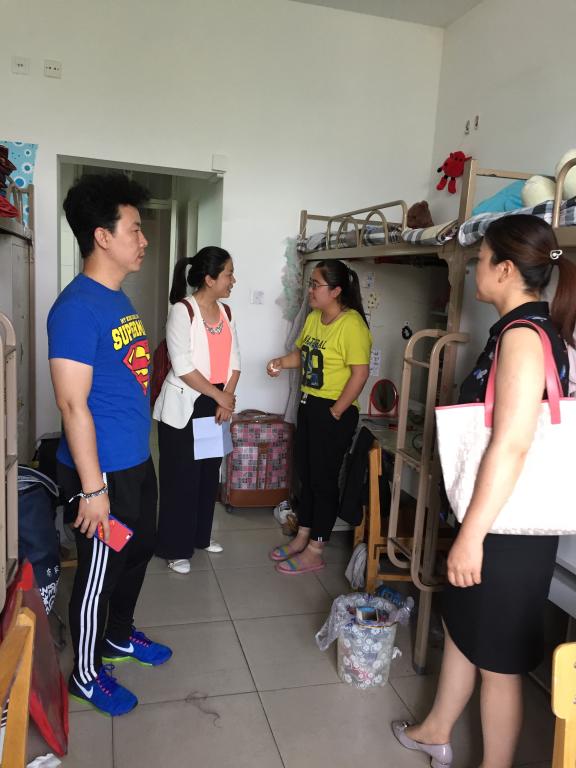 余洁副书记向宿管阿姨询问了我院毕业生退宿情况,几位老师走访毕业生宿舍,查看宿舍清扫情况,并询问了因考试还未退宿同学的考试安排和行程,并为他们送上了温馨的提示和殷切的期望。