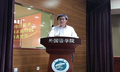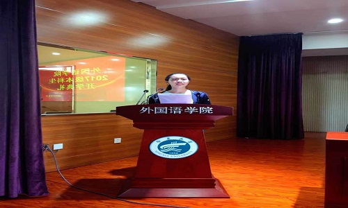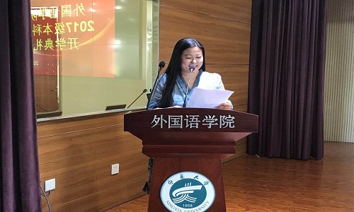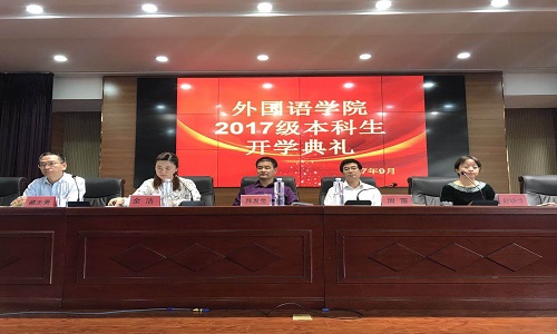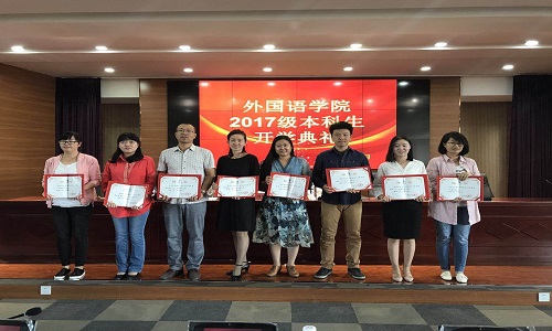 开学典礼在庄严的国歌中拉开帷幕。首先,由院党委书记拜发奎老师宣读《350vip8888新葡的京集团,关于聘任宋晓龑等八名教师担任2017级兼职班主任的决定》,并由院领导向老师颁发聘书。紧接着,2017级英语专业学生陆美彤同学代表2017级新生发言。在发言中,她表达了自己对大学生活的美好期盼和入学感想,并向同学们发出“团结同学,尊师向学”等倡议。随后,由2014级英语专业学生、院学生会副主席刘淑君代表老生发言。她讲述了自己的心得体会并对新生送出美好祝愿。紧接着,教师代表金丽华老师发言。她以流利的英文向新生表示欢迎,在发言中,她说到“They say a person needs three things to be truly happy in this world:someone to love,something to do,and some vision to hope for.”令大家陷入沉思,受益匪浅。