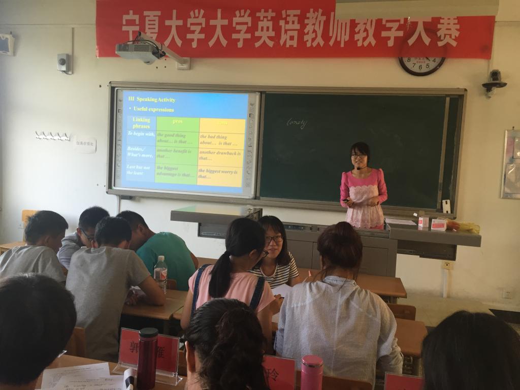 为了进一步加强我校大学英语教师队伍建设,促进我校大学英语教学质量的提升,350vip8888新葡的京集团,公共外语教学部9月7日下午3:00,在宁夏大学贺兰山校区1教D203教室举办了“宁夏大学大学英语教师教学大赛”。本次大赛分为综合组和视听说组,共有七名教师参加比赛。