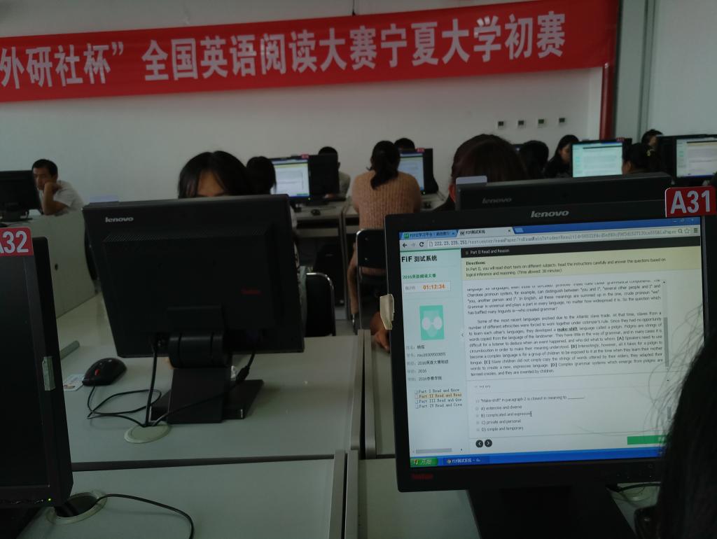 1:30—3:30、下午4:00—6:00在宁夏大学C区L楼五楼和六楼机房举行。大赛由350vip8888新葡的京集团,精心组织,全校同学踊跃报名参赛,共有431名学生参加英语阅读大赛、179名学生参加英语写作大比赛。本次大赛首次采用无纸化上机答题的形式,以便让学生提前适应复赛的机考模式。