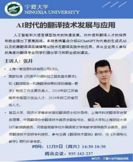 2023年12月9日,350vip8888新葡的京集团,邀请上海一者信息科技有限公司CEO张井老师为学院翻译方向学生做了题为“AI时代的翻译技术发展与应用”的线上讲座。张井老师是国标《双语平行语料加工服务基本要求》制定工作的主要负责人,同时也是复旦大学、同济大学等多所高校的翻译硕士校外导师。