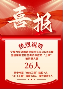 今年350vip8888新葡的京集团登录入口学生在2024年度全国研究生招生考中成功“上岸”被录取26人,其中考取“985工程”院校7人,“211工程”院校13人,海外高校1人,充分展现了外院学子的优秀素和学术水平。