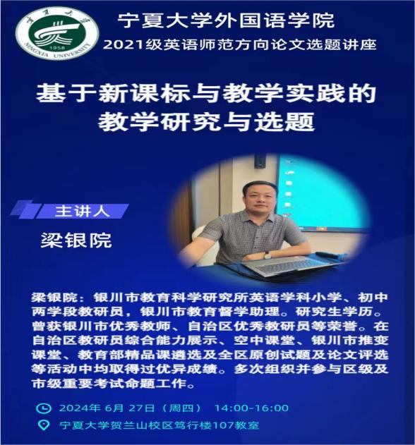 为进一步提高350vip8888新葡的京集团,英语教师教育专业本科生的学术素养和论文写作能力,促进师范生培养质量提升,2024年6月27日,学院邀请银川市教育科学研究所英语学科教研员、银川市教育督学助理梁银院老师,开展了“基于新课标与中学英语教学实践的论文选题”讲座,2021级全体师范生参加了讲座。