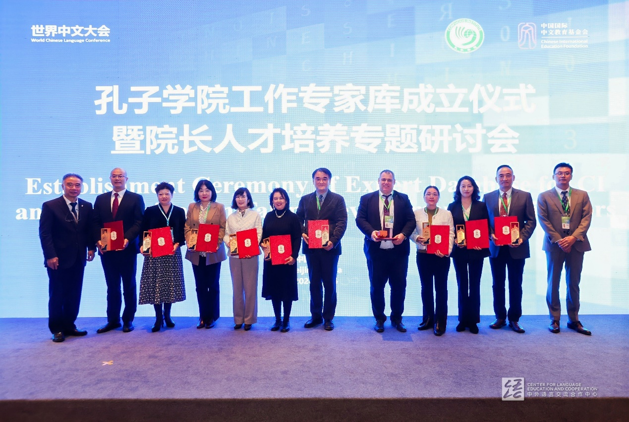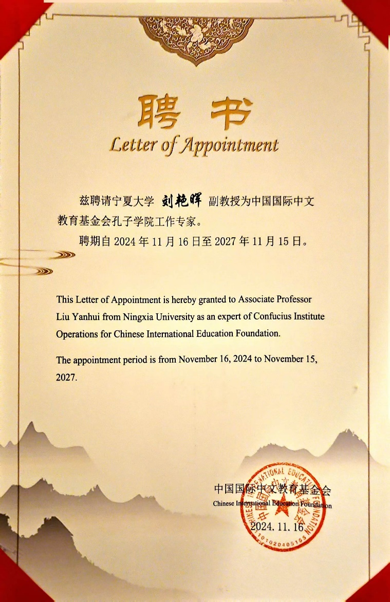 作为全国首批28位受聘专家,刘艳晖与其他中外方学者、院长共同接受了聘书及奖杯的授予。此次受邀不仅体现了刘艳晖院长在担任孔子学院院长人才培养领域的卓越成就和突出贡献,也展示了宁夏大学专家学者在国际中文教育方面的深厚底蕴和实力。