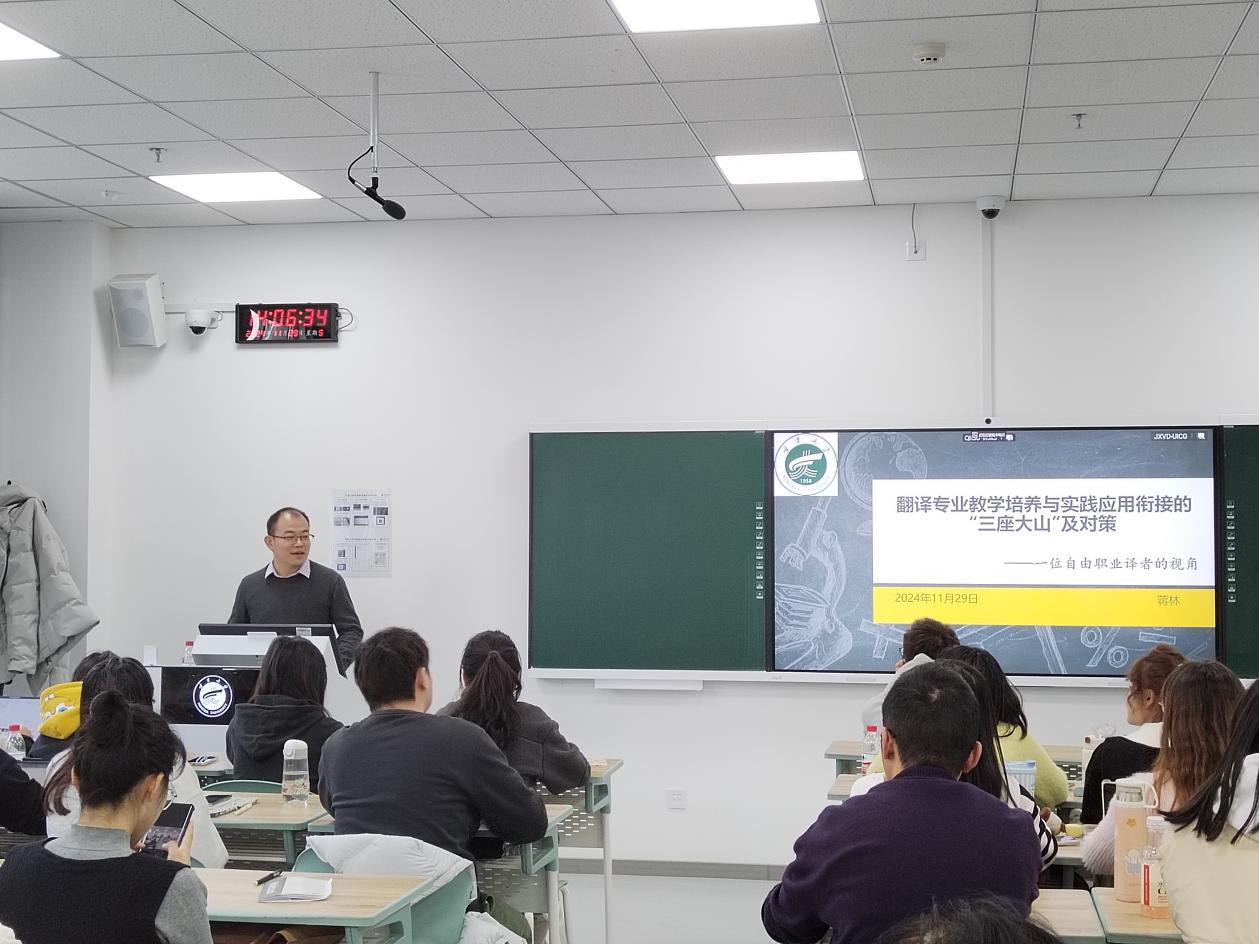 11月29日下午,翻译行业的资深专家蒋林老师应邀为我院师生开展题为“翻译专业教学培养与实践应用衔接的‘三座大山’及对策 ——一位自由职业译者的视角”的主题讲座。本次讲座由刁俊副教授主持,350vip8888新葡的京集团,全体翻译硕士及部分教师参加讲座。