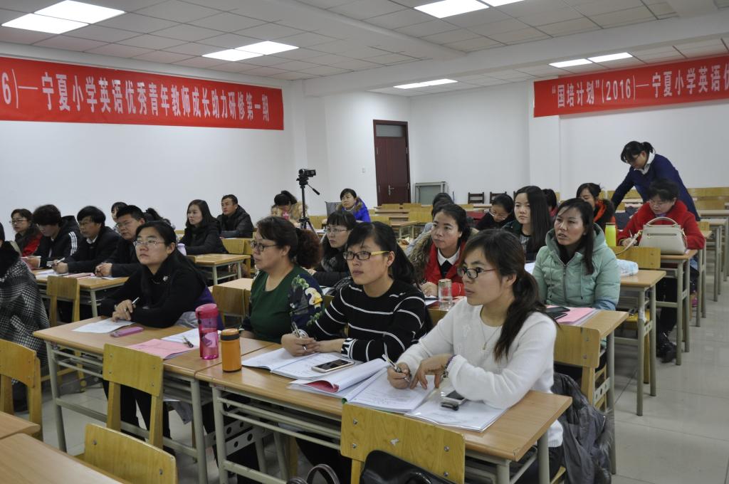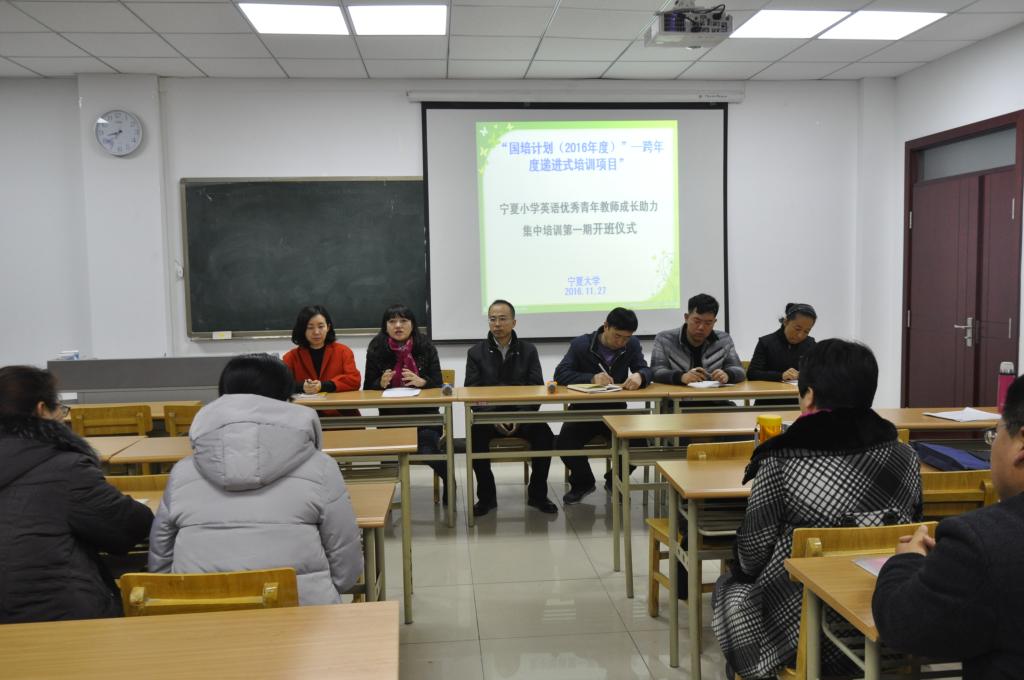 2016年11月27日上午,由350vip8888新葡的京集团登录入口承办的教育部“国培计划(2016年度)跨年度递进式培训项目”——宁夏小学英语优秀青年教师成长助力集中培训第一期开班仪式在350vip8888新葡的京集团,213教室举行。开班仪式由李文军副院长主持。首先,350vip8888新葡的京集团,党委书记王宏武老师受邀作开班讲话,王书记代表350vip8888新葡的京集团,对各位参训老师们的到来表示热烈欢迎,并结合本期培训主题强调了教学科研紧密结合的意义,同时也对学员老师们在培训期间的生活和学习提出了要求。其次,项目秘书宋晓龑老师介绍了本期培训主题、课程安排及学员评价指标等大家关心的问题。最后,李文军副院长在回顾了上期培训的情况的基础上,强调了本期培训的主题及目标与要求,指出新课标下优秀青年教师应具备的科研能力,鼓励大家踏实学习、认真探索,切实落实教学科研齐头并进的骨干教师的目标。