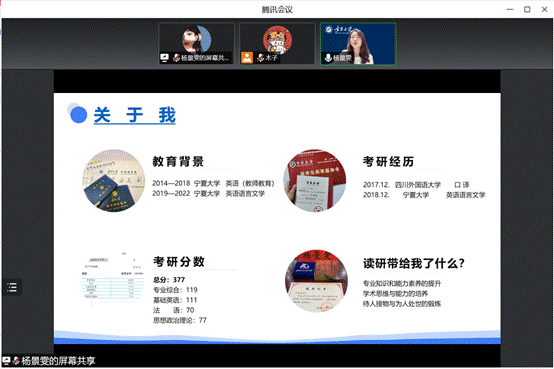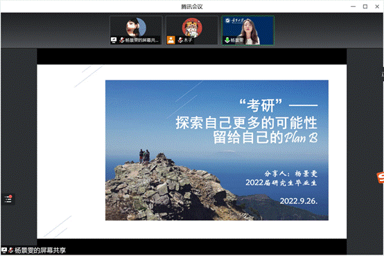 正值考研报名之际,为进一步帮助350vip8888新葡的京集团,2023届毕业生梳理报考相关流程与信息,2022年9月26日晚7:30,特邀我院2022届优秀研究生毕业生、现就职于宁夏医科大学的杨景雯为2023届毕业生开展考研报考辅导讲座。